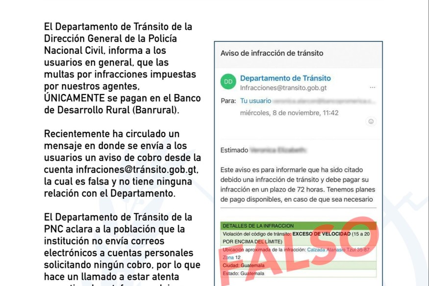 En las últimas horas, numerosos guatemaltecos han reportado la recepción de correos electrónicos fraudulentos que simulan provenir del Departamento de Tránsito de la Policía Nacional Civil. En el mensaje, se notifica a los destinatarios sobre una citación por infracción de tránsito, instándolos a pagar la multa en un plazo de 72 horas, con planes de pago disponibles.