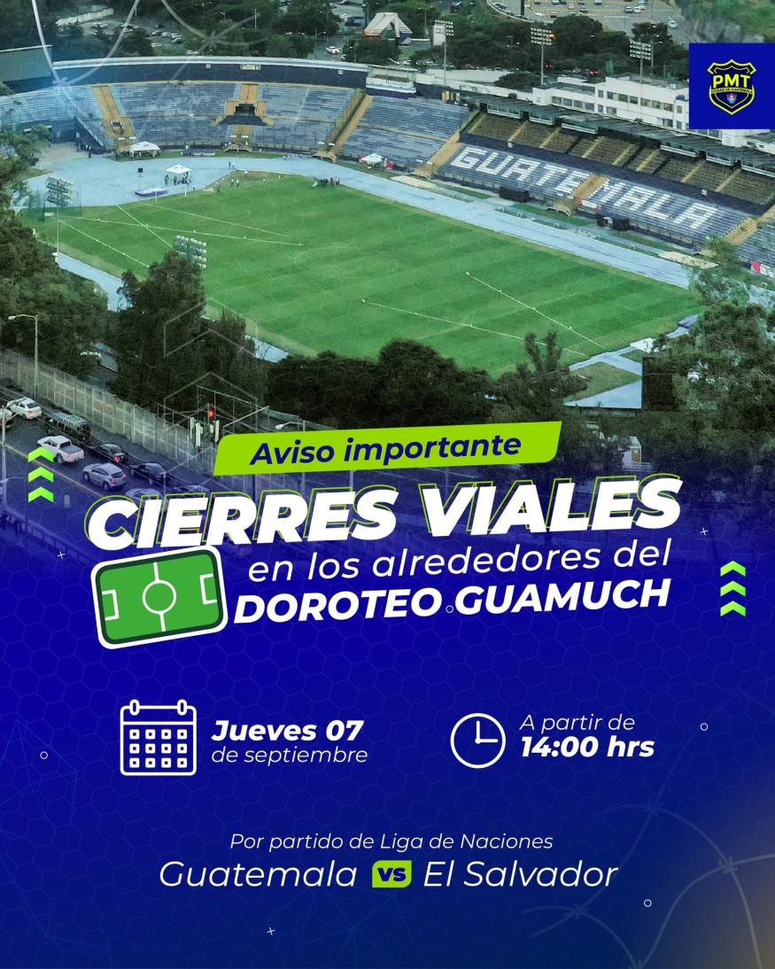 La Policía Municipal de Tránsito (#PMT) informa a la ciudadanía que debido al esperado partido de fútbol entre las selecciones de Guatemala y El Salvador, programado para el jueves 07 de septiembre a las 20:00 horas en el estadio Doroteo Guamuch, se llevarán a cabo cierres viales en las inmediaciones del recinto deportivo.