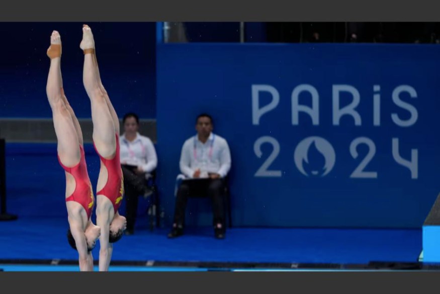 Las saltadoras chinas Quan Hongchan y Chen Yuxi, de China, lograron la medalla de oro en la prueba de saltos sincronizada de plataforma de 10 metros femenina, en su presentación de los Juegos Olímpicos de París 2024.