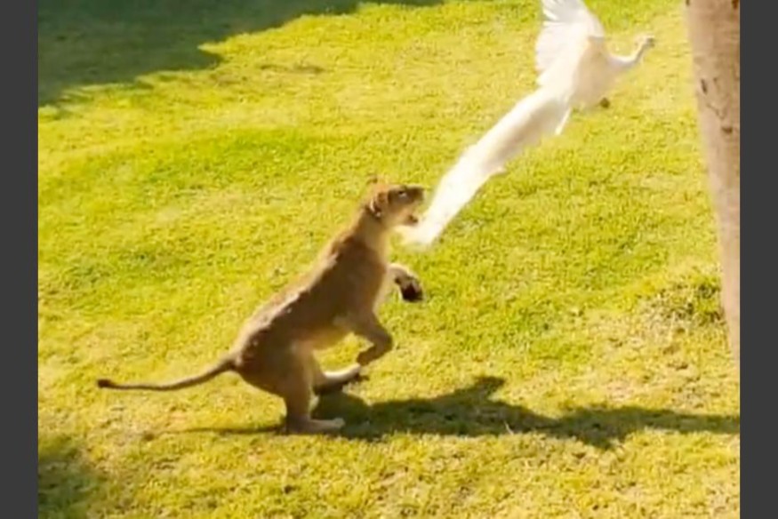 En esta nueva grabación se pudo observar al león perseguir por varios segundos al ave de color blanco, la cual pese a que intentó volar y ponerse a salvo, le fue imposible y terminó siendo devorada.