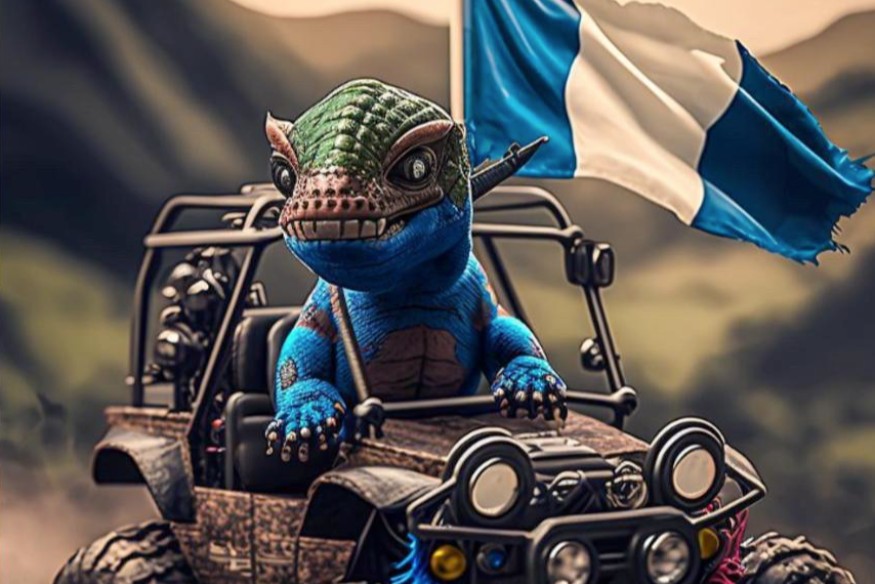 En estos podrás ver diferentes dinosaurios sobre cuatrimotos. Lo sorprendente del arte es que incluyen la bandera de Guatemala e incluso uno de los autos está pintado de azul y blanco.