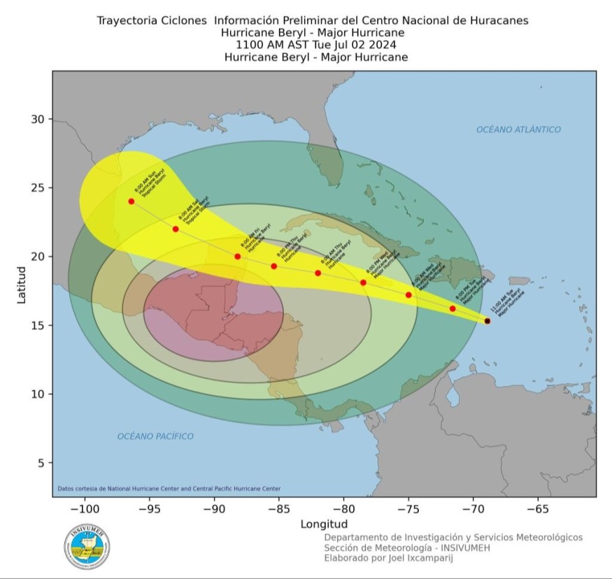 El gigantesco huracán Beryl, de categoría 5, que se encuentra en estos momentos al norte de Venezuela, se desvía cada vez más en su ruta hacia el norte, separándose momentáneamente de Guatemala, quien podría solo recibir el impacto de los fuertes vientos que lo acompañan de 240 kilómetros por hora, según lo expresara el licenciado Alder Bethancourt, vocero del Instituto Nacional de Sismología, Vulcanología, Meteorología e Hidrología, INSIVUMEH.