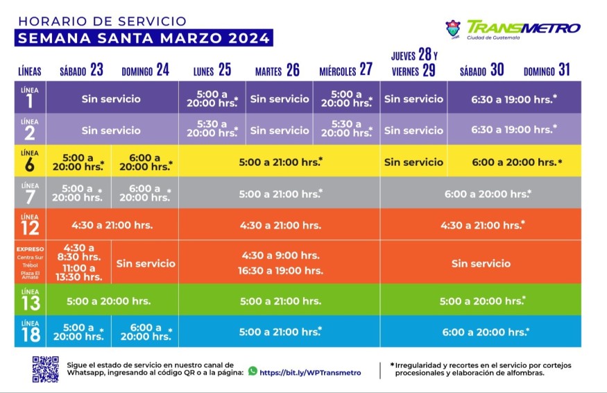 La Municipalidad de Guatemala advierte que el resto de rutas tendrá horario normal. Sin embargo, los tiempos de llegada pueden variar de acuerdo al paso de los cortejos procesionales.