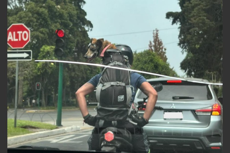 En la imagen se observa a un piloto de motocicleta que llevaba de copiloto a un perro, el can tenía gafas puestas y estaba siendo resguardado dentro de una mochila que sujetaba el motorista.