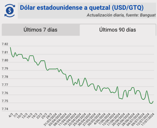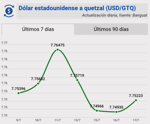 El tipo de cambio del quetzal frente al dólar, para este miércoles 17 de julio quedó en Q7.75223. Se registra una variación de 0.00293 para este día.