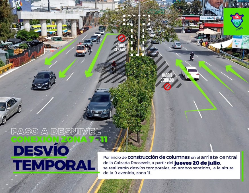 En una medida destinada a avanzar en la construcción del paso a desnivel en la Calzada Roosevelt, se informa que los carriles izquierdos de la 9ª Avenida en la zona 11 y la 7ª Avenida en la zona 7 estarán cerrados temporalmente. Estos cierres permitirán la construcción de las bases centrales del puente en dicho tramo.
