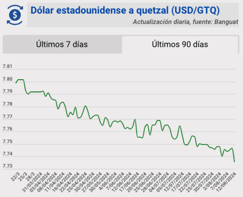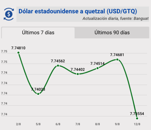 El tipo de cambio del quetzal frente al dólar, para este lunes 12 de agosto, quedó en Q7.73554. Se registra una variación de 0.01127 para este día.
